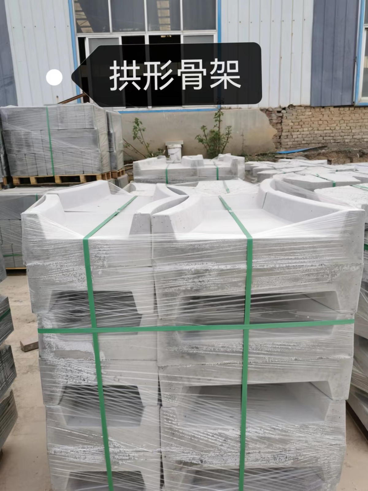 (5)澆注,對拱形骨架模板內(nèi)采用C20混凝土現(xiàn)澆成型,澆注從拱形骨架的護腳由下而上進行澆注,澆筑時先對排水槽以下的拱形骨架混凝土進行澆筑,待排水槽以下的拱形骨架混凝土達到初凝前及時對拱形骨架排水槽的混凝土進行澆筑,達到兩次澆筑一次成型,澆注完成后進行收面平整,并及時覆蓋灑水養(yǎng)護度