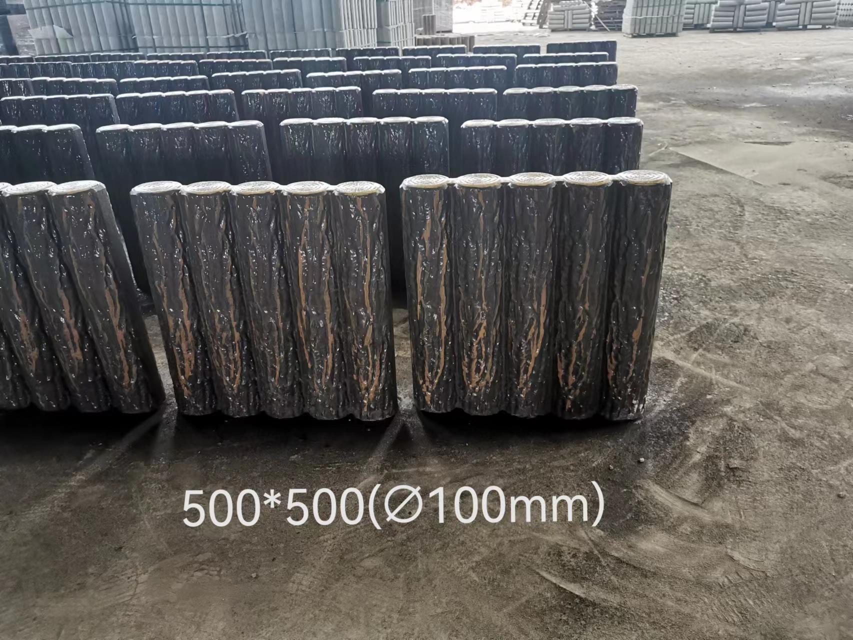 采用模具生產(chǎn),水泥沙石通過攪拌機攪拌。在灌入水泥沙石以前,模具先噴油,噴油主要方便后期脫模。隨后再把水泥沙石灌入仿木樹樁石模具中、采用往復(fù)式成型機往復(fù)生產(chǎn),將鋼筋放置入水泥沙石料中隨后靜置等待脫模。
